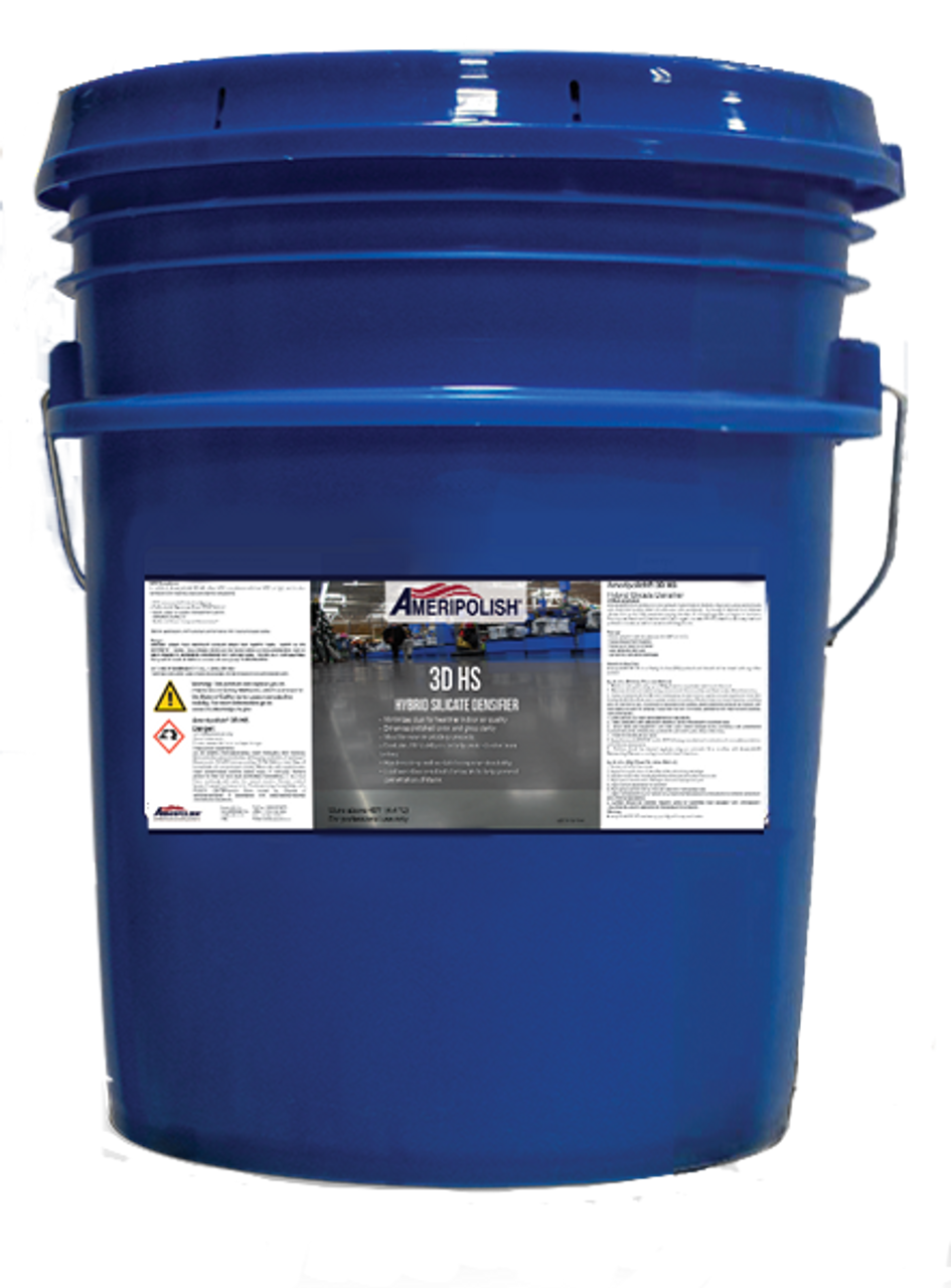 Ameripolish® 3D (3 densifiers in one product) Hybrid Silicate Densifier improves surface performance and resists the harmful effect of traffic wear and weathering. By having 3 different size molecule silicates this product fully penetrates varying densities of concrete regardless of region or hardness. This improves the abrasion resistance for new or aged concrete. 3D HS is ideal for use on exposed and polished concrete, as well as cements with integral color