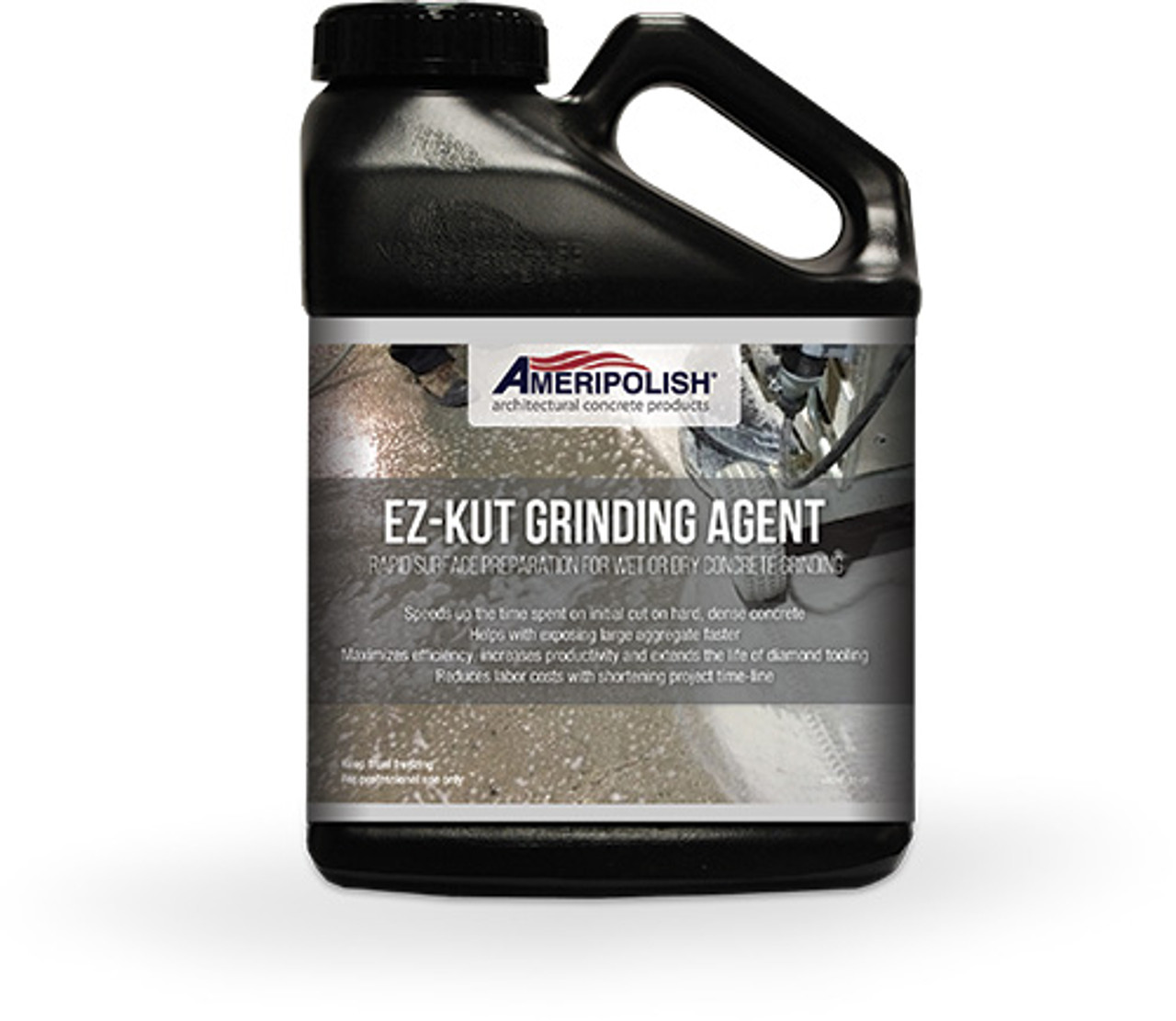 Ameripolish® EZ-Kut Grinding Agent is a water-based rapid surface preparation agent used for the initial cut on hard, dense concrete and helps with exposing large aggregate faster than dry-only or standard wet methods. EZ-Kut also helps by dramatically increasing the productivity of lower-grit diamond tooling. EZ-Kut Grinding Agent achieves this by suspending concrete solids away from the surface for diamond tools to achieve maximum efficiency. This then shortens the project timeline, reduces labor costs, and extends the life of diamond tooling. Can be used as part of a full-flood wet process or as a mist as part of dry grinding. EZ Kut also contains 3%-5% Densifier in order to help densification during the initial cutting process