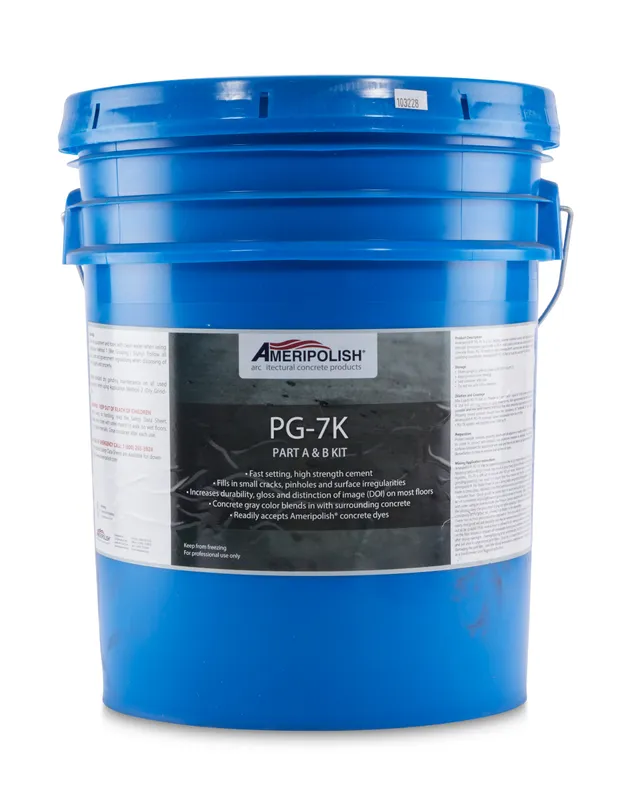 Ameripolish® PG-7K is a fast-setting, polymer-modified, high-strength cement with outstanding bonding properties formulated specifically to fill in small cracks, pinholes, and surface irregularities in concrete floors. It also increases durability, gloss and distinction of image (DOI) on most floors. PG-7K readily accepts Ameripolish® concrete dyes and requires no special polishing procedures. Ameripolish® PG-7K Part A – Powder must be used with PG-7K Part B – Liquid