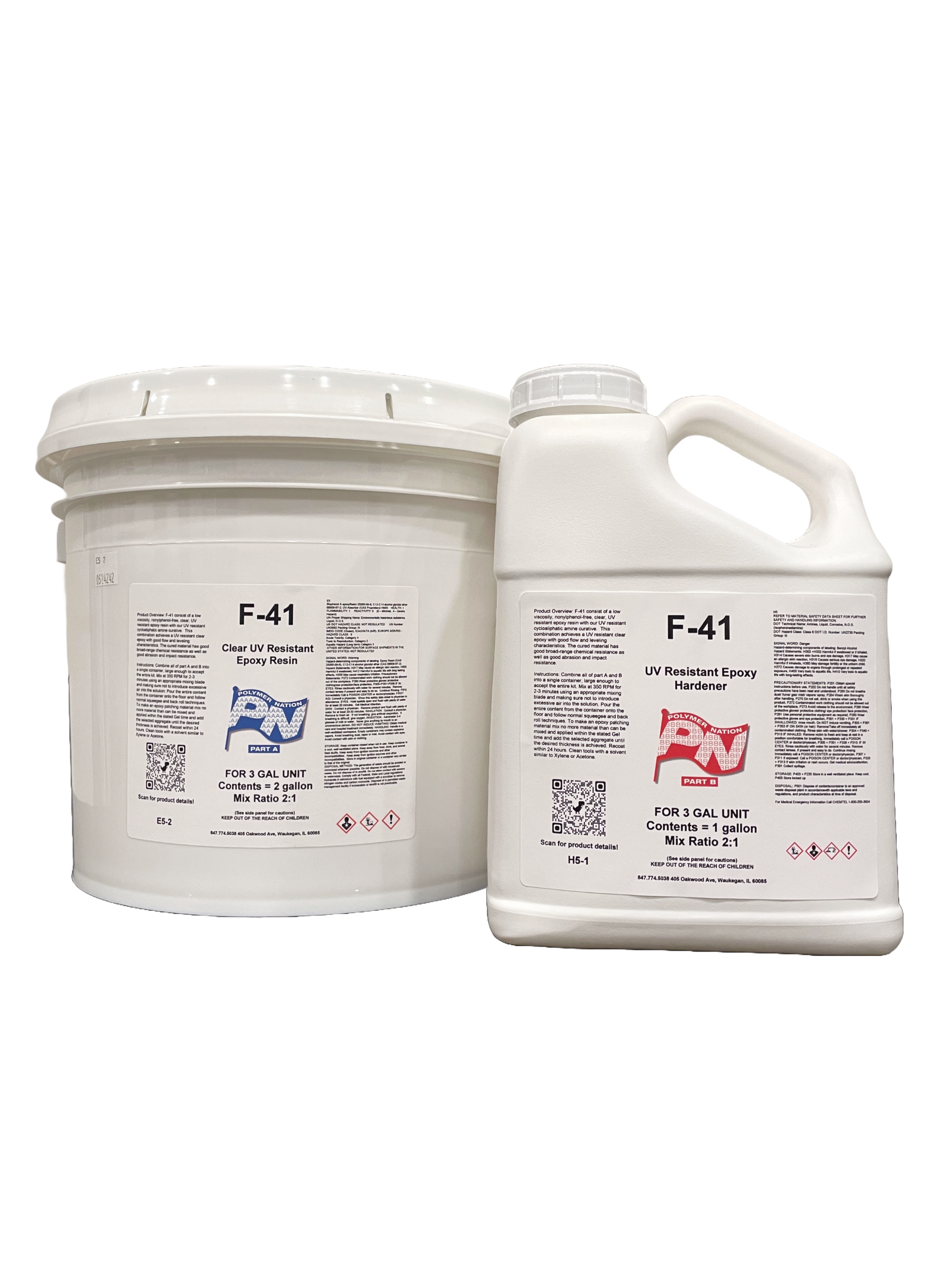 Polymer Nation F-41 consist of a low viscosity, nonylphenol-free, clear, UV resistant epoxy resin with UV resistant, cycloaliphatic amine reactant. This combination achieves a UV resistant, clear epoxy with good flow and leveling, characteristics. The cured material has good broad-range chemical resistance as well as good abrasion and impact resistance.