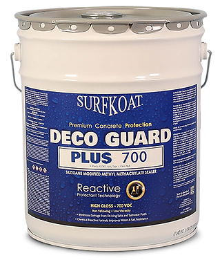 Deco Guard Plus 700 VOC is recommended for use on new or existing concrete. It is a non-yellowing, high gloss, Siloxane Modified Methyl Methacrylate with a low viscosity for better penetration on concrete substrates. Its unique Siloxane Modified Methyl Methacrylate formula provides superior water and salt resistance compared to standard sealers used to protect exterior concrete. Deco Guard Plus 700 VOC has Improved resistance to de-icing road salts, salt water pool systems, rain, sleet and snow due to our advanced chemical reactive formula.