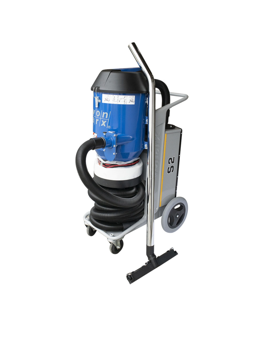 The S2X Dust Extractor is specifically made to remove dust produced by working with concrete. It works best when connected to a grinder, scarifier, shot blaster, or saw that is small to medium in size. The S2X has a 3-step filtration process that allows for continuous operation without filter clogs. Additionally, the filter can be cleaned without having to open the unit, and the dust can be collected in a Longopac bag. This helps to protect the operator from inhaling harmful dust particles while using the S2X Dust Extractor.